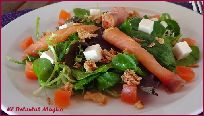 Sobre la ensalada ponemos el salmón enrollado, los dados de queso blanco y la cebolla frita. Terminamos con un hilito de aceite.