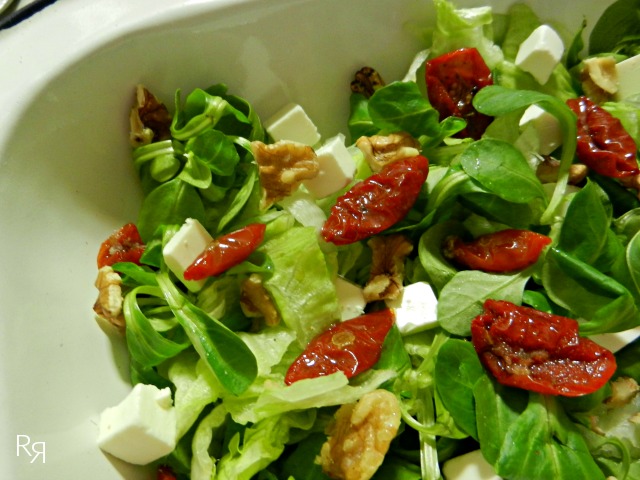 Hoy, al fin, ha bajado un poquito la temperatura; llevamos unos días que no apetece cocinar y diría que casi no apetece ni comer, sólo beber y beber así que, aprovechando esta tregua que nos ha dado el termómetro, vamos a preparar una ensalada con tomates secos que aunque es muy sencilla tiene un sabor espectacular.