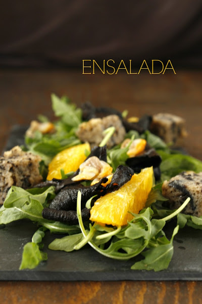 Y hoy, variando algunos de los ingredientes os traigo una ensalada con rúcula, trompetas de la muerte, naranja, y bocados de aceitunas negras. ¿A que es largo el título? Pero es una ensalada riquísima, fácil de preparar, y siempre podéis cambiar o quitar algún ingrediente de la receta para que esté a vuestro gusto.