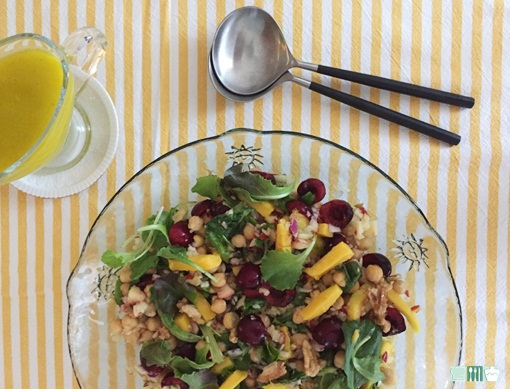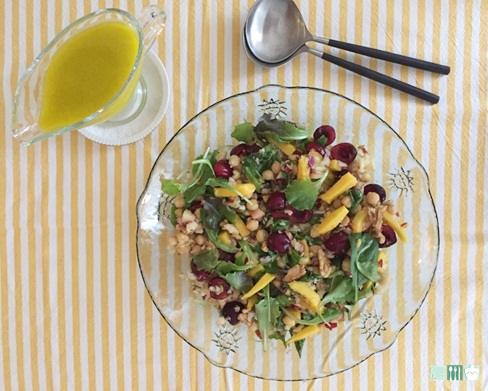 Deshuesar las cerezas y ponerlas en una fuente junto con la lechuga y los garbanzos, añadir la cebolla, el apio y la manzana troceada, incorporar las nueces y los bastones del mango. Reservar mientras preparamos la vinagreta.