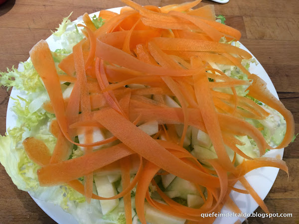 Con la ayuda de un pela-verduras cortamos la zanahoria y la ponemos en la ensaladera.