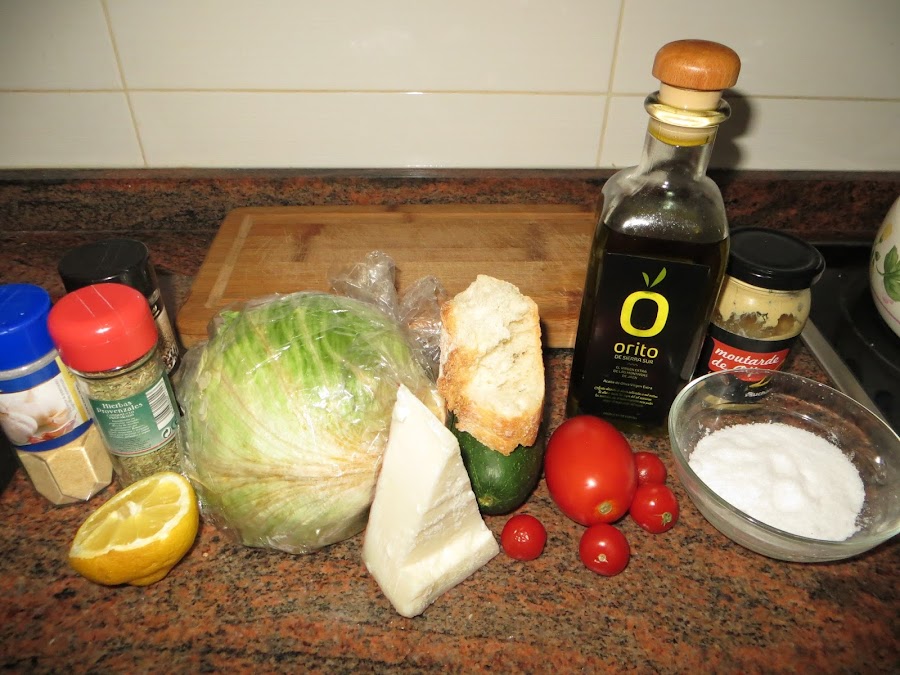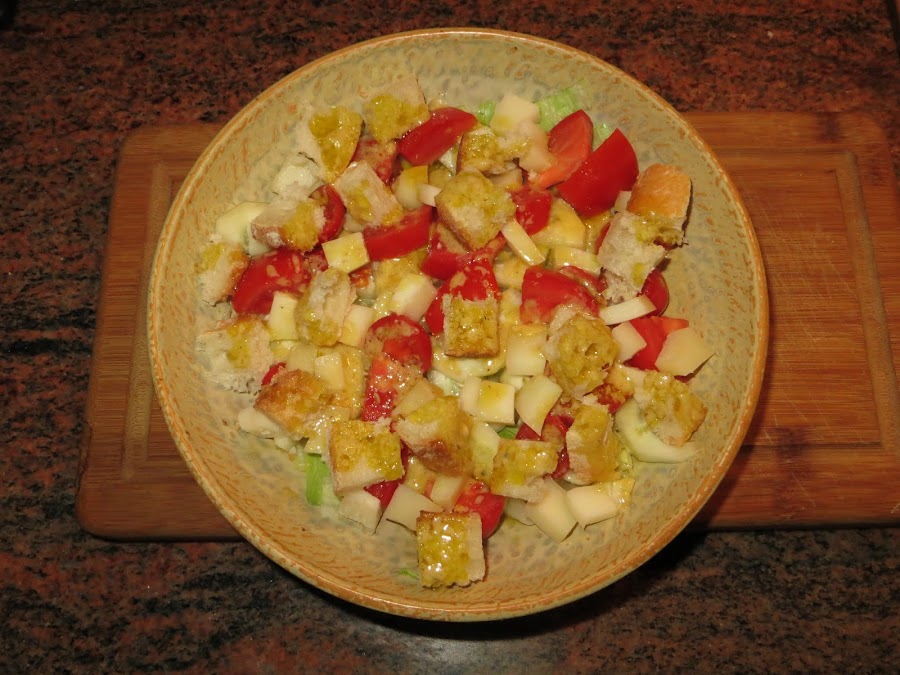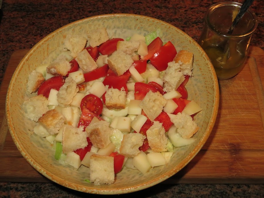Mientras tanto picamos la lechuga y cortamos en trozos pequeños el tomate, el queso, el pepino y el pan. Una vez que lo tenemos todo en una ensaladera, le añadimos la vinagreta y ya está lista para comer.