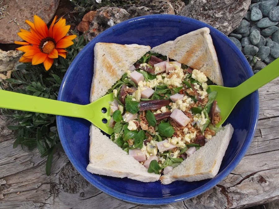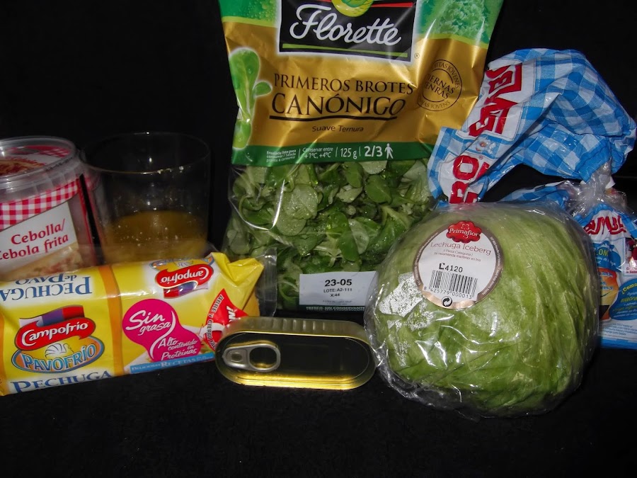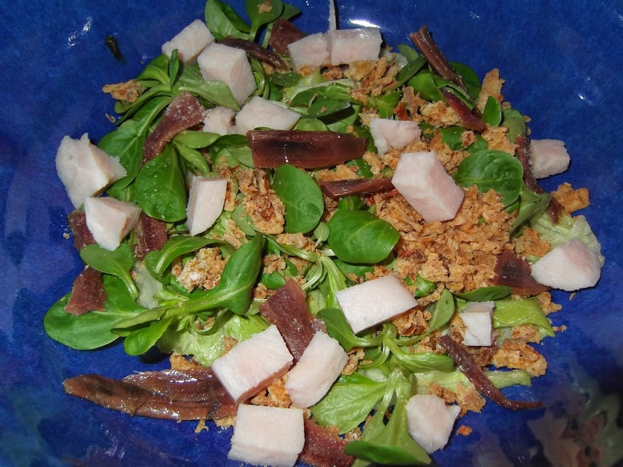 Ahora vamos con la ensalada, se parte la lechuga y se pone en el fondo del bol para ensaladas, luego se añaden los canónigos, se parte el pavo en trozos pequeños y se añade al bol. Se abre la lata de anchoas, se escurre el aceite, se cortan y se echa y finalmente se añade la cebolla frita. Se tuestan las dos rebanadas de pan y se ponen para decorar.