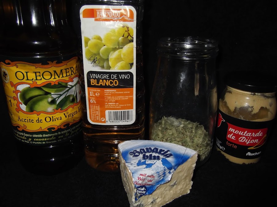 El día que vamos a preparar la vinagreta, echamos en un vaso grande la mostaza, el vinagre y poco a poco vamos añadiendo el aceite y el queso y vamos emulsinando. El queso lo podéis desmenuzar o hacer como yo que lo deje en cachitos pequeños para luego ir encontrándonoslo mientras comemos la ensalada. La vinagreta se termina echando un poco de orégano, podéis añadirle también sal, pero con el queso yo creo que es suficiente.