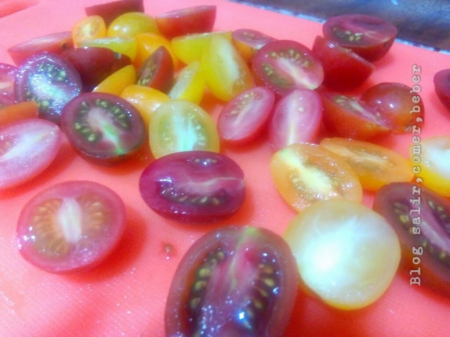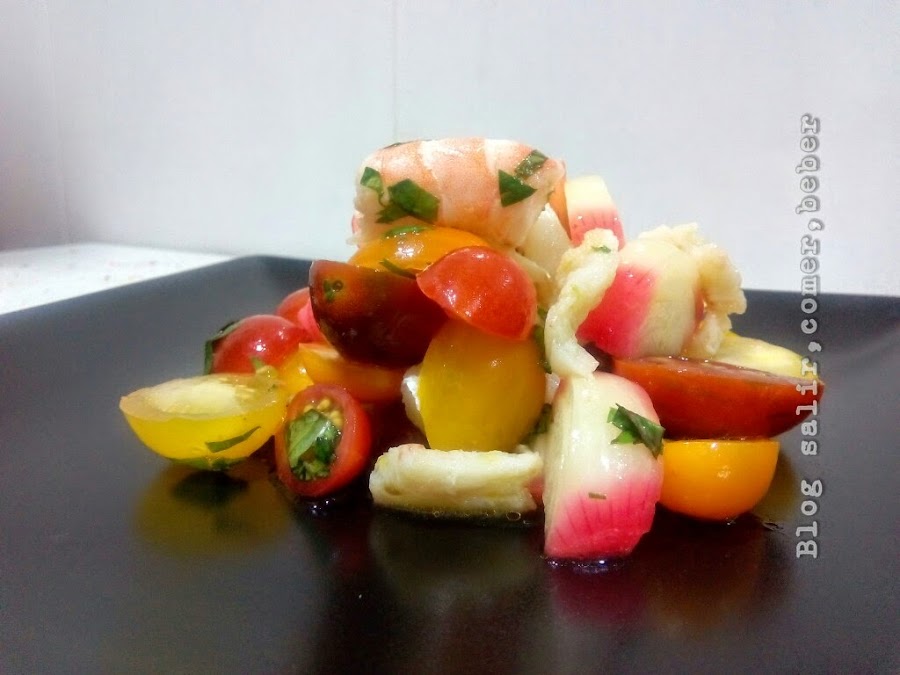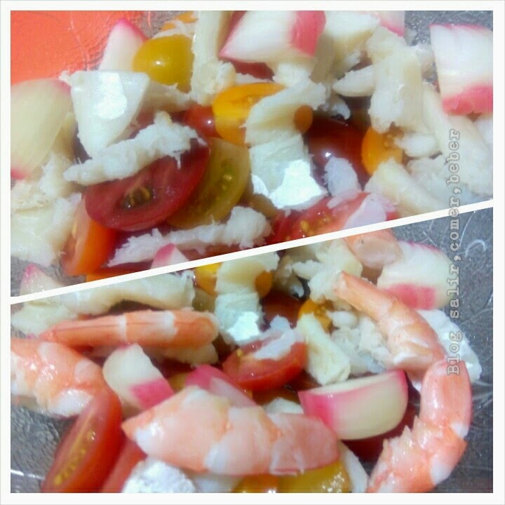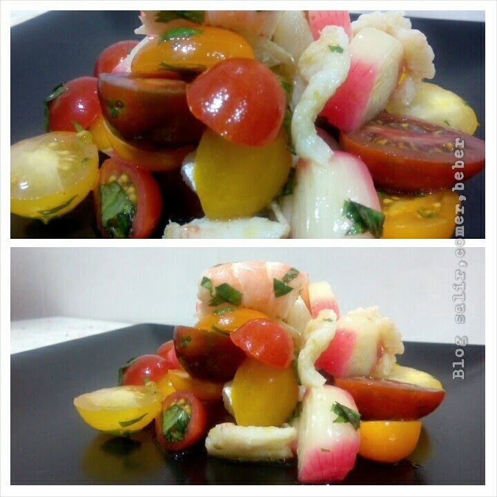 Para preparar esta ensalada hemos comprado un mix de tomates cherry de diferentes variedades ( en Carrefour tenéis para elegir), loS hemos partido a la mitad, y los incorporamos a un bol junto a unas migas de bacalao desalado, unos langostinos cocidos y unas cebolletas en vinagre ( también podrían quedar muy bien unos pepinillos, alcaparras o cualquier encurtido)