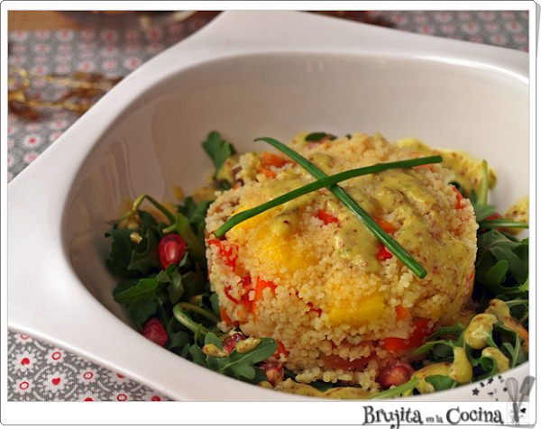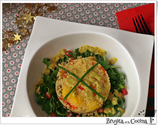 Para servir ponemos una base de rúcula y después encima con un aro de emplatar colocamos el cous cous, rociamos con unas semillas de granada y aliñamos.