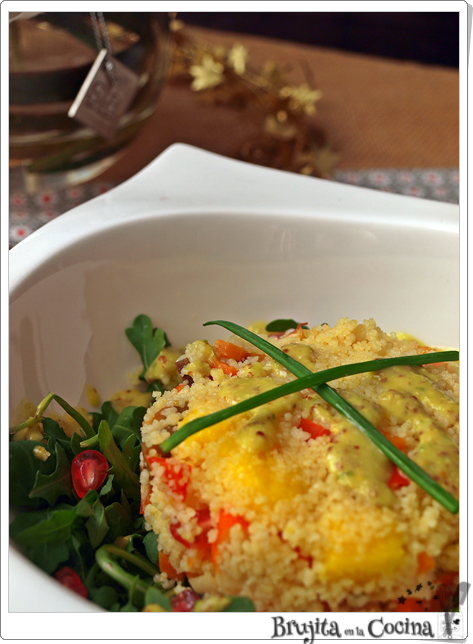 Una vez listo el cous cous, agregamos unas gotas de aceite de sésamo y con un tenedor lo desgranamos, lo vertemos en una ensaladera, le agregamos la mezcla de fruta y verdura.