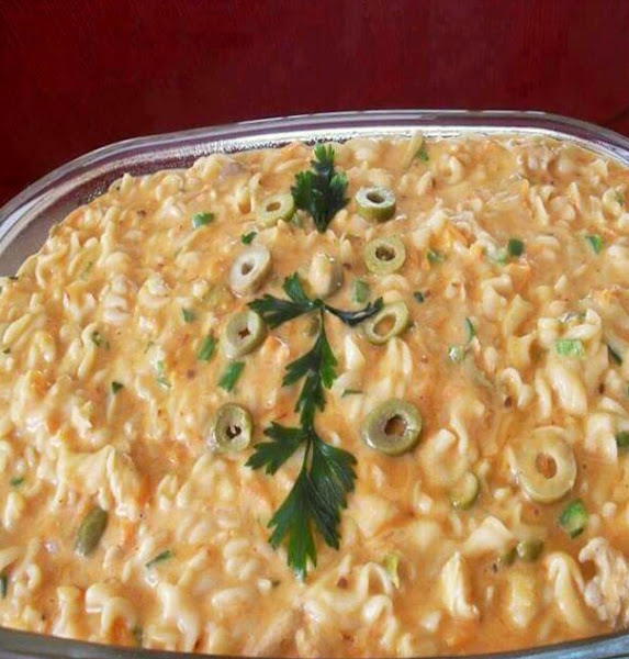 Licuar queso crema,salsa de tomate ketchup,natilla,jugo de limón,salsa inglesa,sal,pimienta,azúcar y tabasco agregar a un tazón,agregar la cebolla picada fina,apio,cebollin,aceitunas y el atún mezclar bien,colocamos la pasta de tornillos cocinada y fría mezclamos bien,refrigerar unas 3horas mínimo antes de servir antes de servir.