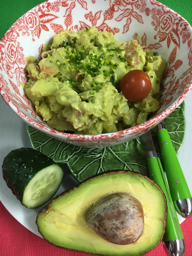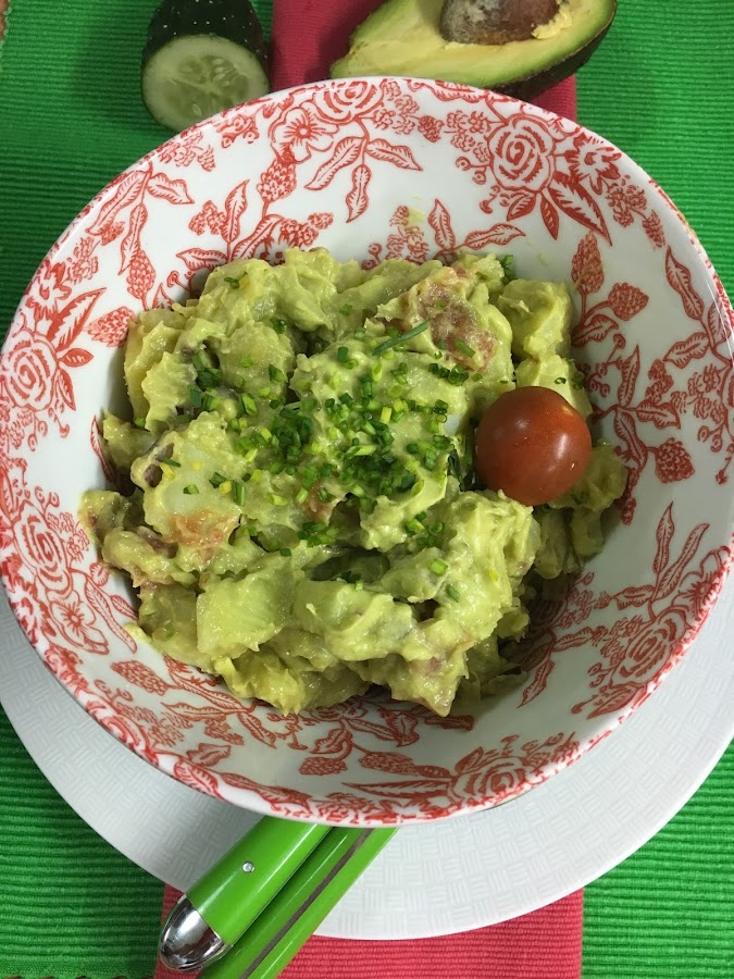 Es un plato muy refrescante y colorido, llenito de vitaminas y antioxidantes. La clave está en triturar muy bien el aguacate con la batidora para que quede una salsa cremosa que bañe muy bien las patatas.