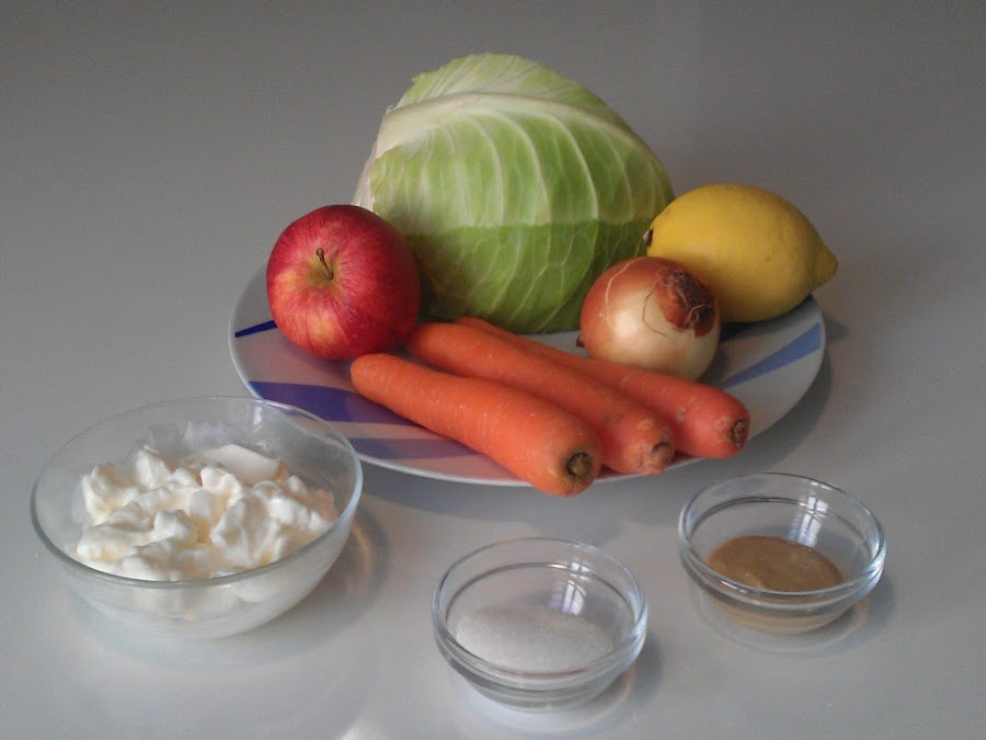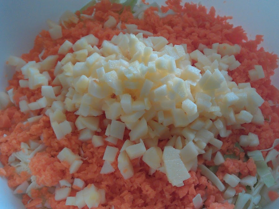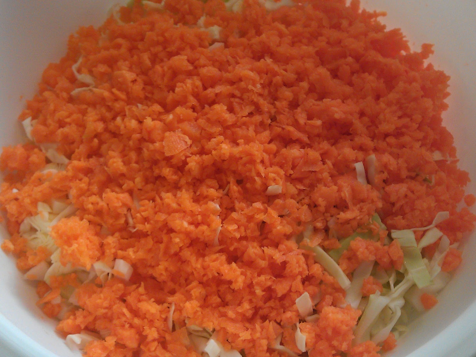 2. - Rallar la zanahoria con la picadora, o comprar zanahoria rallada fresca y cortarla en trozos más pequeños, y las añadimos a la col.