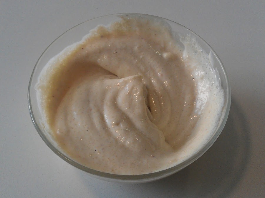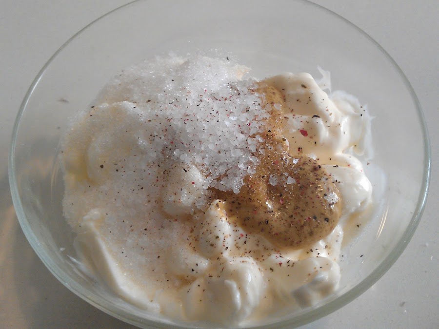 4. - Pasamos a la salsa, ponemos 4 o 5 cucharadas de mayonesa, la mostaza, el azúcar, la sal y la pimienta y mezclamos bien.