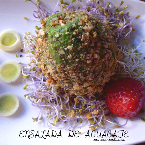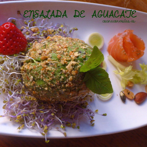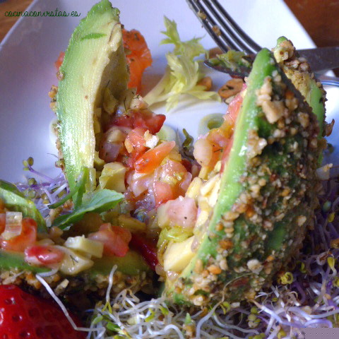 Colocamos el aguacate relleno y “rebozado” sobre los brotes tiernos.