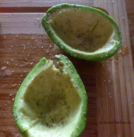 Rellenamos las dos mitades de un aguacate con la mezcla que teníamos en el frigo, procurando que esté bien escurrida.