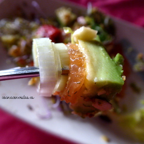 En un bol picamos muy pequeñito el salmón marinado, las fresas, el tallo de apio (hojitas incluidas), el aguacate reservado y el puerro. Mezclamos todo bien y le añadimos el eneldo, el zumo de naranja, el zumo de lima y el aove.