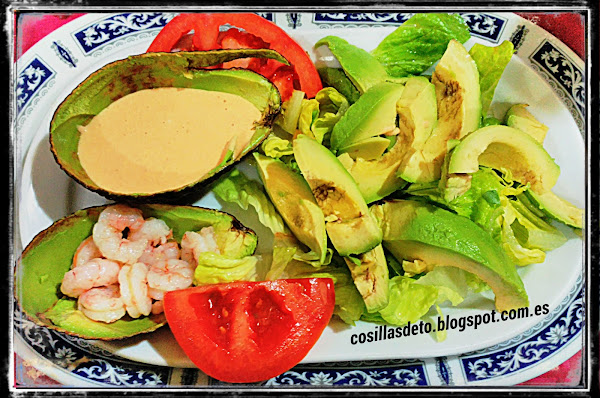 en un lateral, las cascaras del aguacate con la salsa rosa en el otro las gambas (así cada comensal puede añadirlos a su gusto) terminamos con dos trozos de tomate.