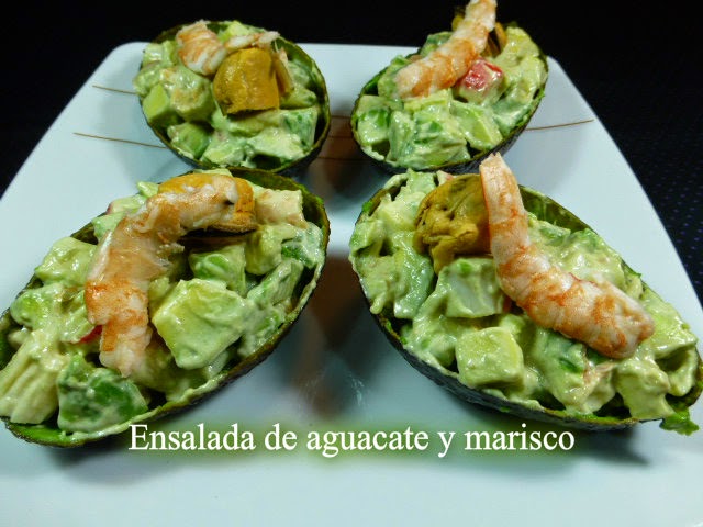 Cortamos los aguacates en cuadraditos. Mas o menos del mismo tamaño que cortamos las gambas y mejillones.