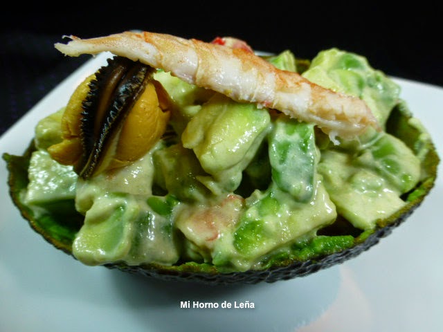 Ya rellenadas las pieles de aguacate decoramos con los mejillones y gambas que reservamos.