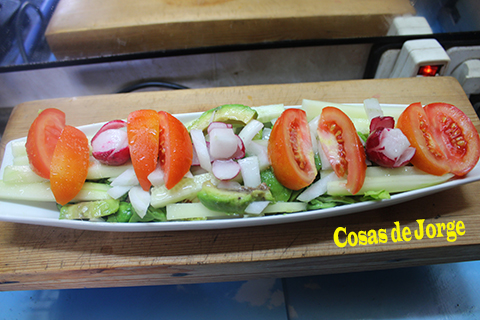 Colocamos las tiritas de aguacate intercaladas entre la lechuga.