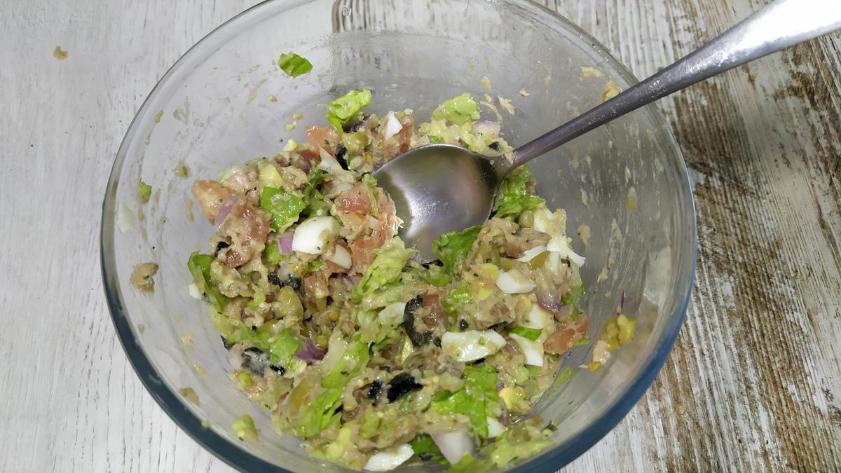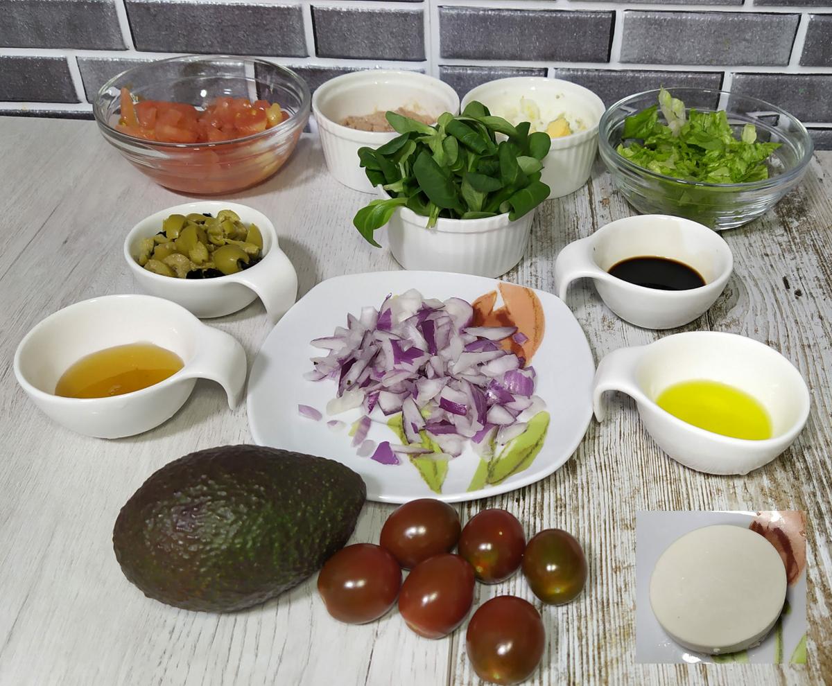 Picamos la hoja de lechuga, el tomate, las aceitunas, el huevo cocido y la cebolla morada.El aguacate lo vamos a vaciar, su carne la troceo.