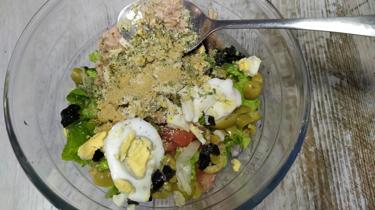 En un bol añado todo lo picado anteriormente más el atún, le añado la sal y las especias al gusto, las que más nos gusten. Le puse pimienta blanca, jengibre en polvo, orégano y ajo en polvo.