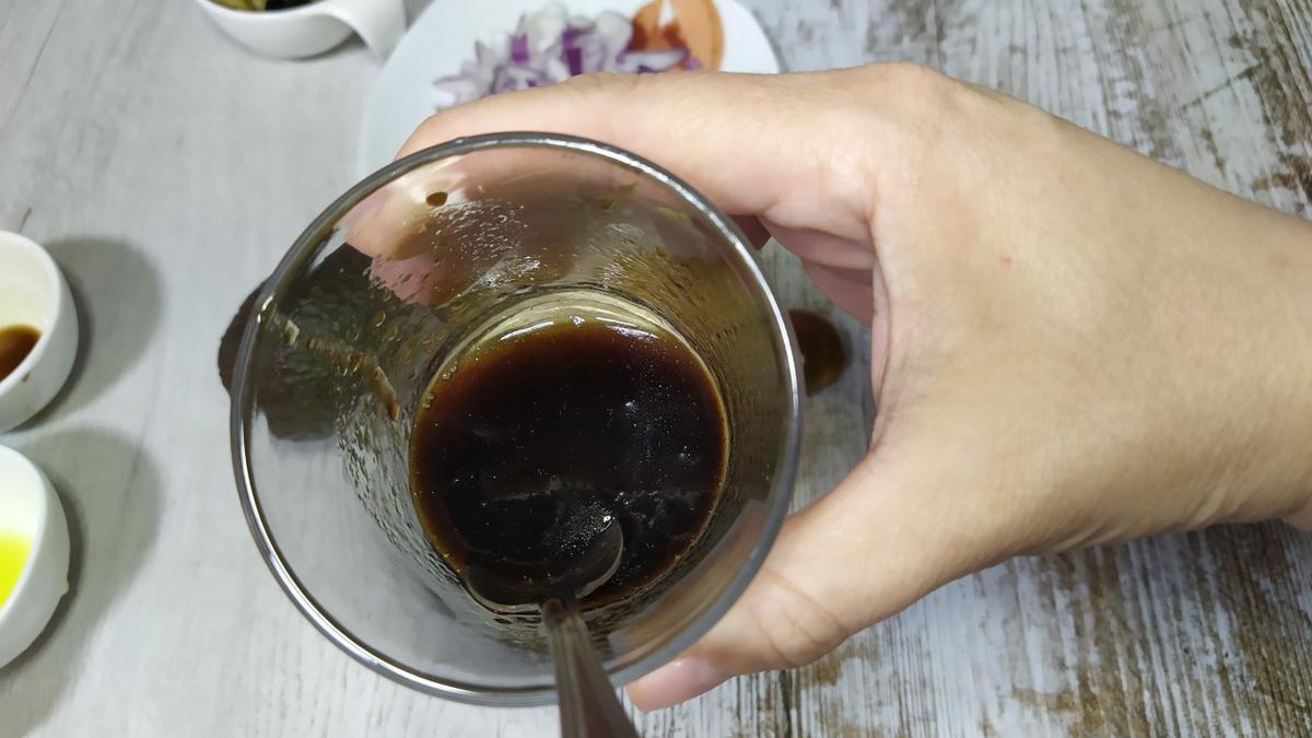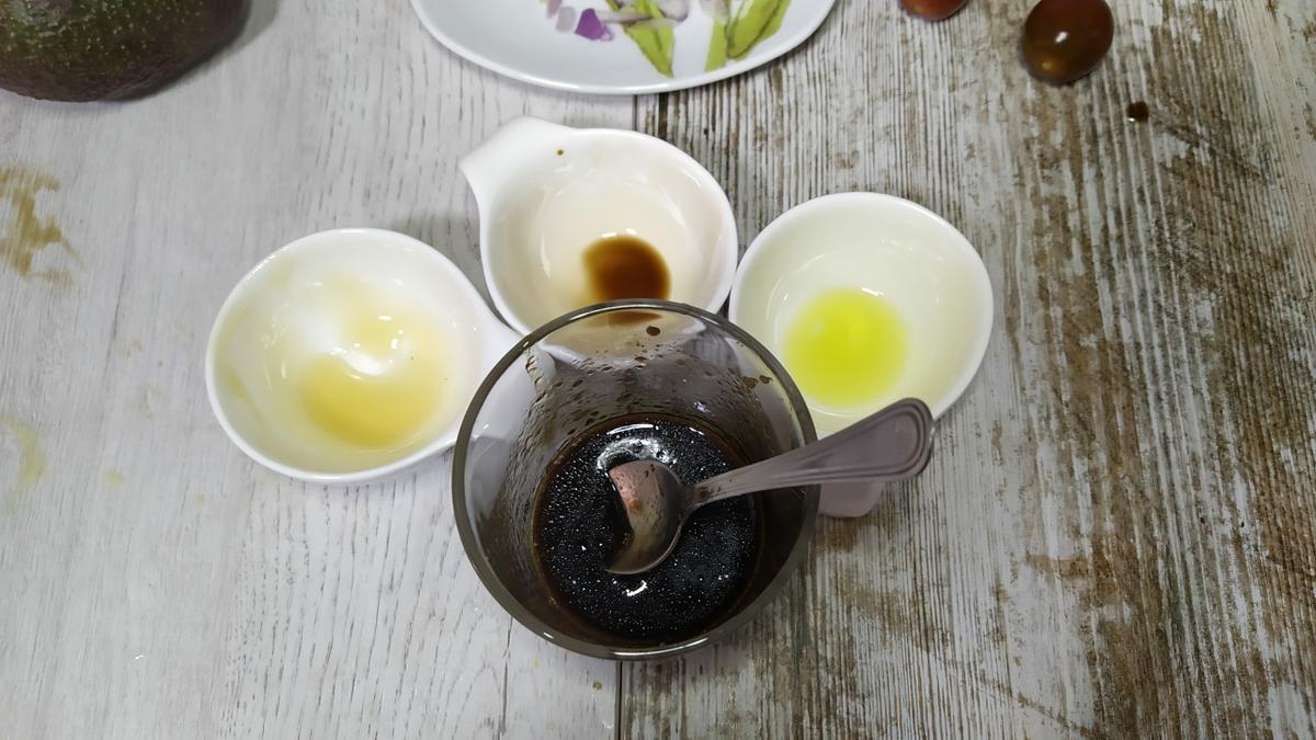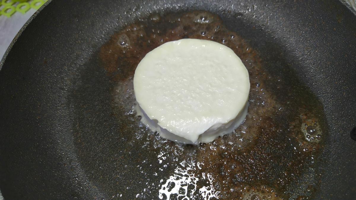 En un vaso pongo una cucharada de miel, los 15 ml de vinagre y la cucharada de aceite de oliva. Mezclo todo bien.Vamos a freír el queso de cabra.