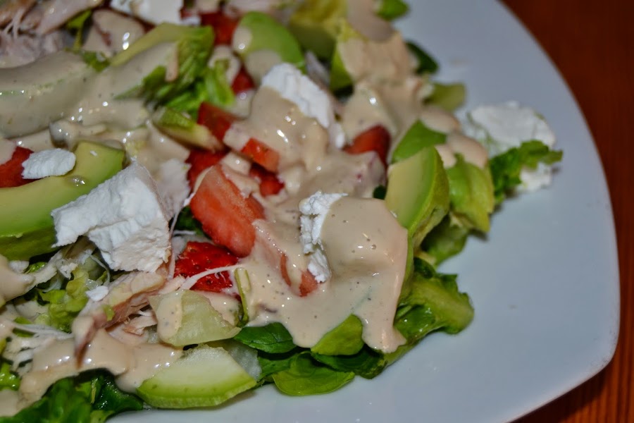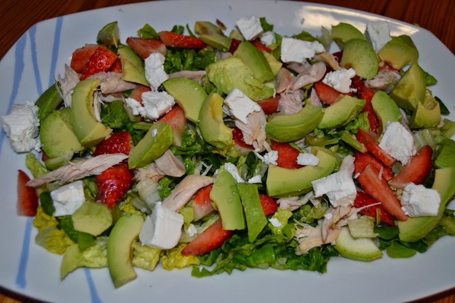 Lavamos la lechuga, escurrimos bien, lavamos las fresas, las disponemos en la fuente con la lechuga, a continuación el aguacate a gajos, el pollo y el queso de cabra.
