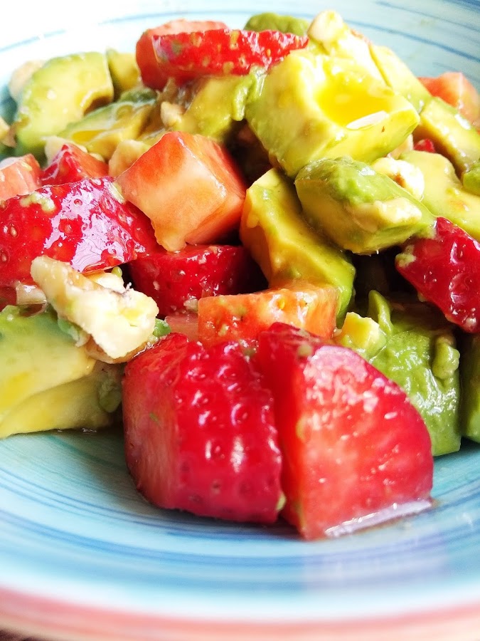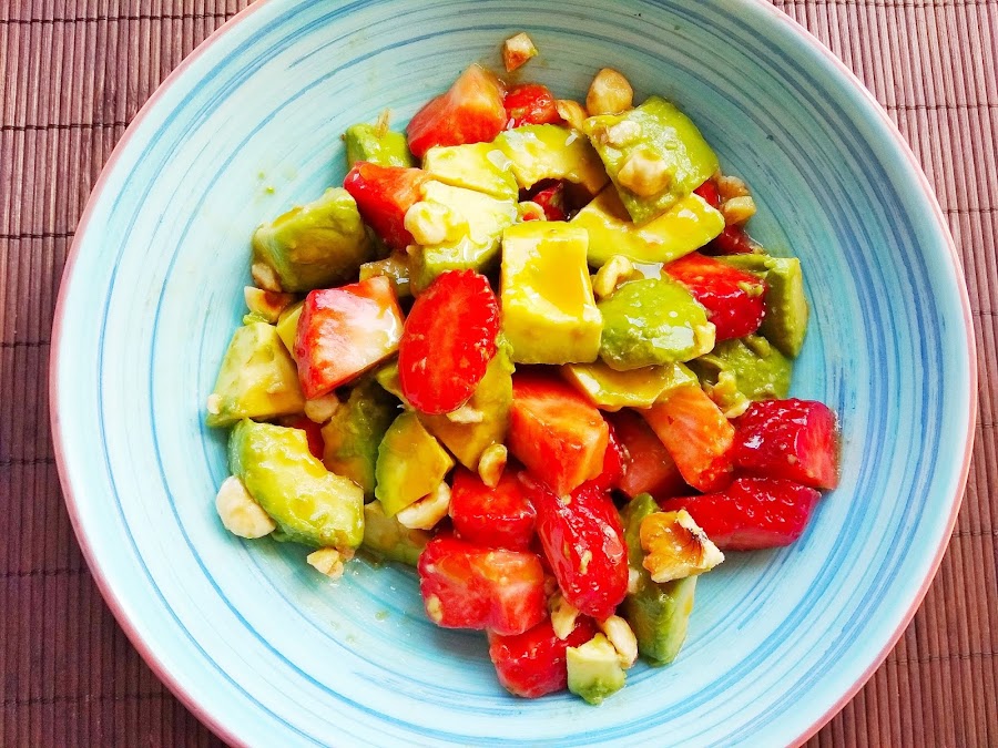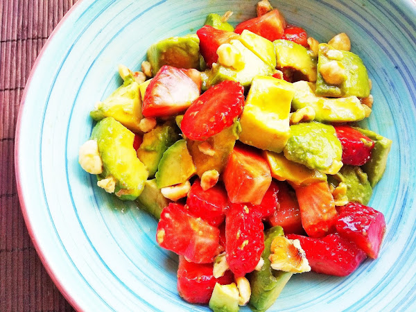 En casa nos encanta el aguacate (sobre todo a Irune y a mí). Lo tomamos sólo, con lechuga y tomate, en las hamburguesas... Donde lo pongas está bueno. Por eso, y aprovechando que las fresas están ahora por todas partes, quise probar la mezcla de aguacate y fresas, y nos encantó. Le hice una vinagreta suave y la acompañé con unos frutos secos. Mira abajo y te digo cómo la hice.
