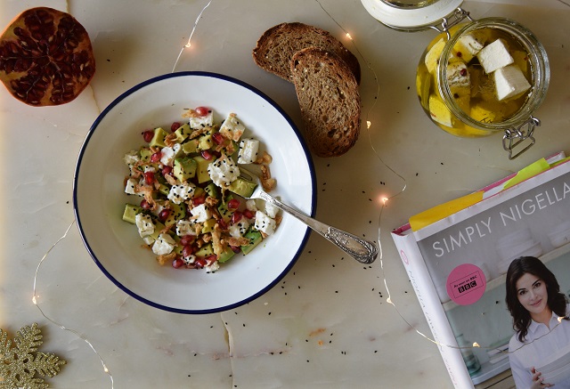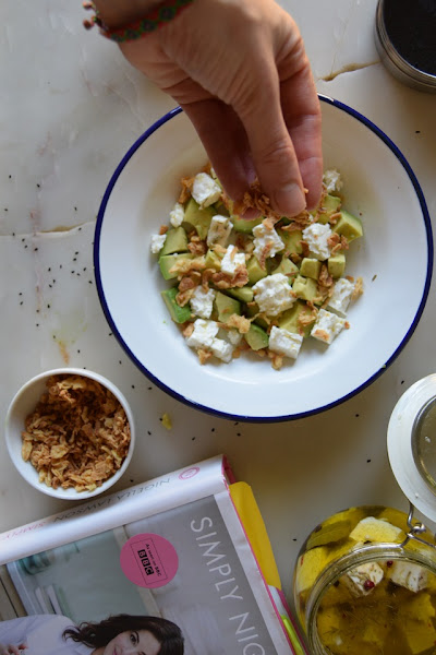 Una ensalada es como el el cajón que hay en todas las casas, el cajón para las cosas que no tienen un cajón. En el que te encuentras los tickets, los imperdibles que se pierden, alguna pila que nadie sabe si tiene bateria o no, bolis, llaves, hilos, linternas, un pin, post-its, navajas, un calcetín, un manual, un trozo de plástico que se guarda por si acaso etc. Además es el único plato en que las verduras se presentaban. siempre. en su versión más perversa, crudas. Y por si no fuera pocos modales vienen perfumadas con la colonia que echan a los niños con piojos, el vinagre. Realmente no había nada peor que una ensalada para mi. Era el Grinch, el Joker, Darth Vather, Lord Voldemort y Ramsay Bolton. Digo era porque creo que lo he superado, pero realmente no. Sigo sin poder comer una ensalada normal, tengo un trauma muy grande que superar, lloré el océano atlántico yo sola por la maldita ensalada, dejadme vivir. Pero ya puedo comer algunas ensaladas, las que yo elijo, las que yo hago a mi imagen y semejanza. Esta es una de las que yo más quiero. No involucra ninguna verdura cruda porque el aguacate es un fruta, para los despistados. No apesta a vinagre sino que se envuelve en el suave terciopelo del aceite. Fue la primera receta que hice del libro Simply Nigella de Nigella Lawson y desde entonces no he dejado que pase una semana sin perder la oportunidad de comerla. Cierto que la he cambiado un poco. Nigella utiliza cebolla en roja en vinagre. Por bonita que sea yo nunca he conseguido olvidar que es cebolla cruda pero esto es un tema mío y si toleras bien la cebolla cruda entonces te sugiero que hagas caso a Nigella la cortes en juliana, la introduzcas en un cuenco pequeño, la cubras con vinagre lo tapes con film y lo mantengas así durante al menos 20 minutos o más si es que lo tienes, el tiempo, porque el resultado es mejor. Parece ser que la cebolla pierde parte de la fuerza sobrenatural que tiene en su estado crudo y además, si es roja, se intensifica su color. Aunque he intentado hacer caso a Nigella, en este caso prefiero a mi amiga la cebolla frita que vale que no es tan saludable pero tampoco están los tiempos como para empezar a disculparse por freír cosas.