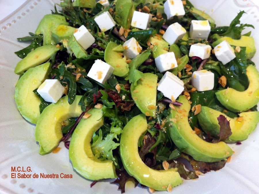 Coloca alrededor el aguacate, en el centro el queso; por último, esparce las almendras y aceite de oliva virgen extra. Sirve.