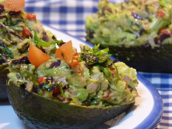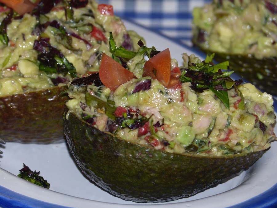 Como sugerencia de presentación podéis rellenar las cáscaras de los aguacates con la ensalada. ¡Queda muy original... y muy bueno!