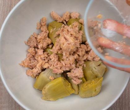 En primer lugar, escurrimos las alcachofas en conservas y las enjuagábamos bien debajo del grifo de agua.Las echamos en un recipiente o ensaladera. Añadimos el atún de lata bien escurrido. Aunque si quieres puedes añadir un poco del aceite en el que viene conservado.