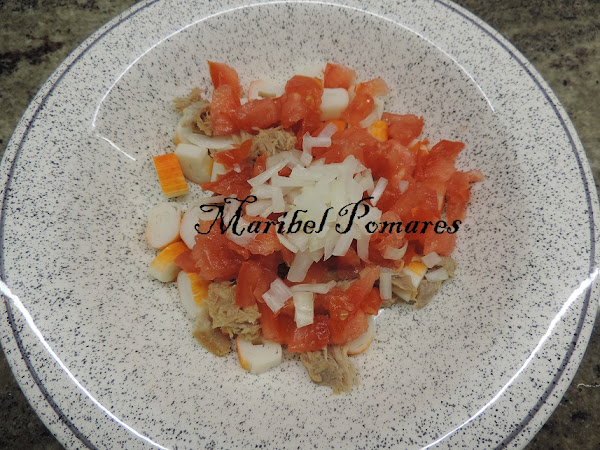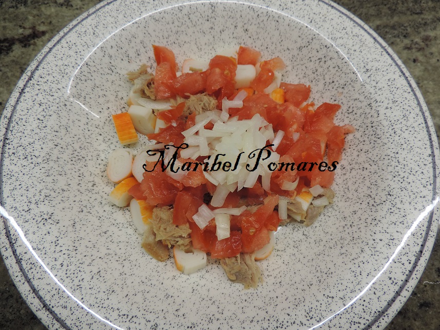 Cortamos el tomate en trocitos pequeños y lo añadimos.