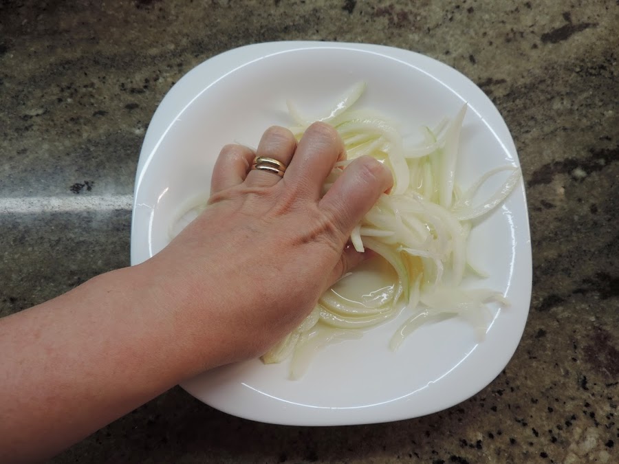 Pasado el tiempo la apretamos o frotamos con las manos, como para mezclarla bien en el vinagre y la sal, esto lo hace mi madre para que pierda el picor y no sea tan fuerte la cebolla.