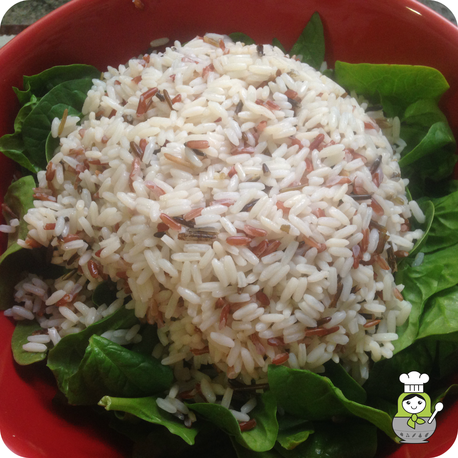 Lo primero que debemos hacer es cocer el arroz (lo ideal es que sea tipo basmati o salvaje). Mientras vamos a preparar el resto de ingredientes. Lavamos bien las espinacas y las colocamos en un bol. Por otro lado, picamos los champiñones en láminas muy finas y lo salteamos un par de minutos en la sartén con un chorrito de aceite. Cuando el arroz haya enfriado completamente, lo colocamos en el centro del bol.
