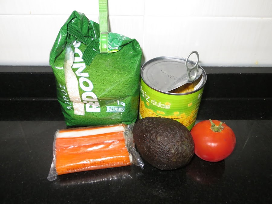 Una vez que tenéis el arroz preparado lo colocáis en un cuenco o plato hondo, peláis el aguacate y se lo añadís, así como el tomate y los palitos de surimi. Finalmente, añadís el maíz y aliñáis la ensalada ya sea con aceite de oliva, vinagre y sal para reducir el número de calorías o con mayonesa.