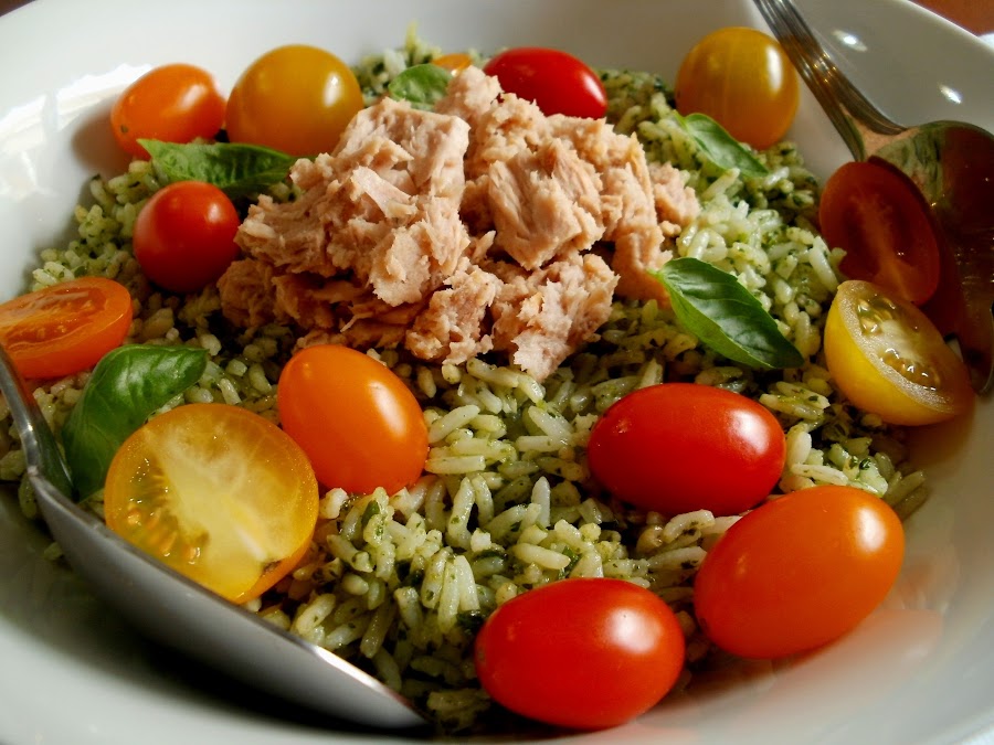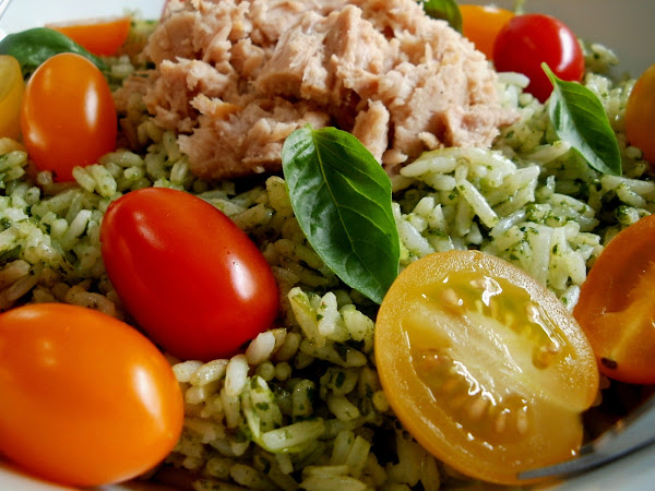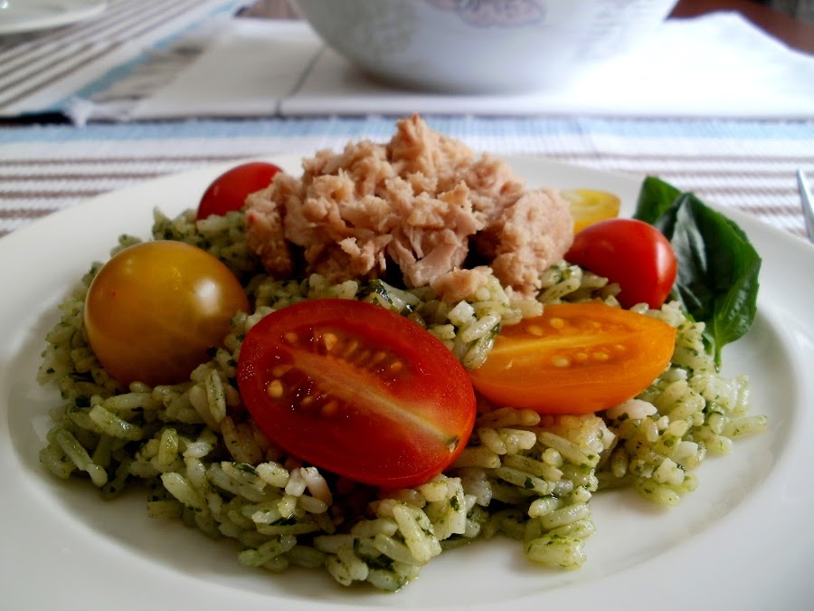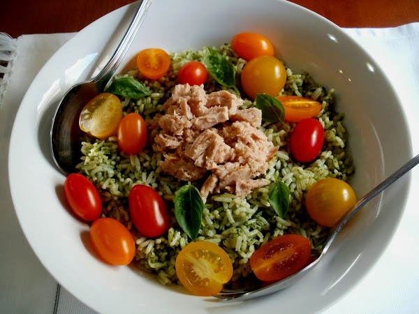 Yo estoy encantada con el cambio, el arroz blanco aderezado con la salsa de albahaca con ajo y aceite de oliva quedó delicioso. Como pueden ver en las fotos, no quise mezclar el arroz con el atún para que tras cada bocado apreciemos el agradable gusto de la albahaca. Si les apetece probar este plato, les recomiendo que lo sirvan tal cual lo ven en la imágenes.