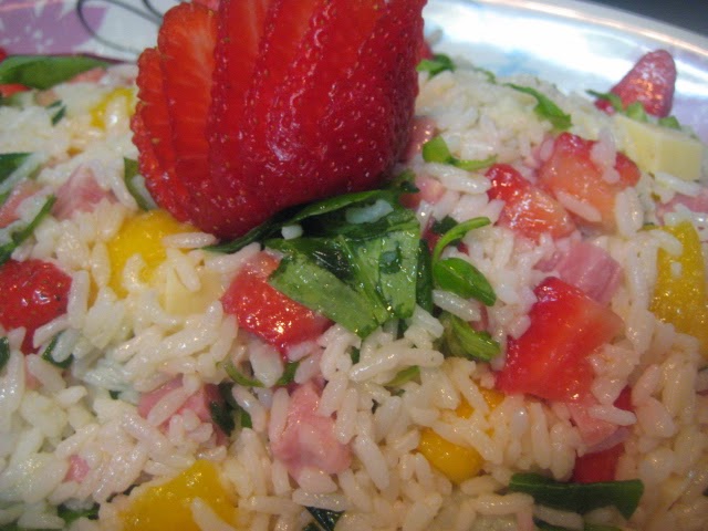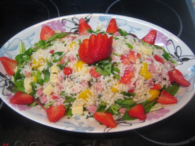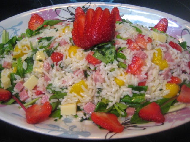 Preparación: Cocer el arroz en abundante agua con sal y una hojita de laurel o unas ramitas de perejil. Una vez cocido pasar por agua fría (refrescarlo), escurrir muy bien y poner en un bol añadiendo un poco de sal y un chorrito de aceite de oliva. Agregar la ensalada elegida troceada debidamente, el jamón cocido, el queso, las fresas troceadas y el mango pelado y troceado (si se emplea). Remover bien pero con cuidado y aderezar la ensalada como más nos guste. Con aceite y un buen vinagre, con una vinagreta por ejemplo de cebollino o con una salsa con base de mayonesa, nata (crema de leche), queso fresco para untar o yogur.