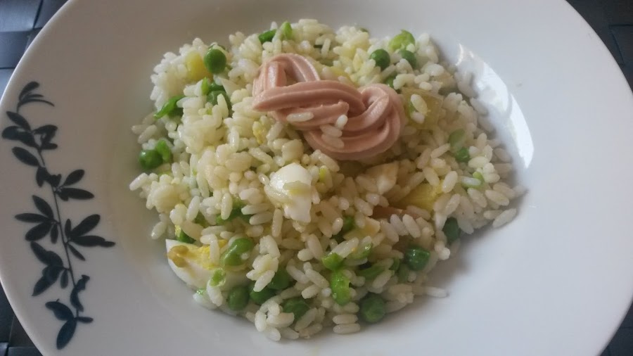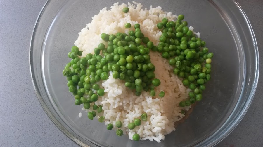 5. Ponemos en una ensaladera el arroz y los guisantes. Añadimos un chorrito de aceite de oliva y mezclamos.