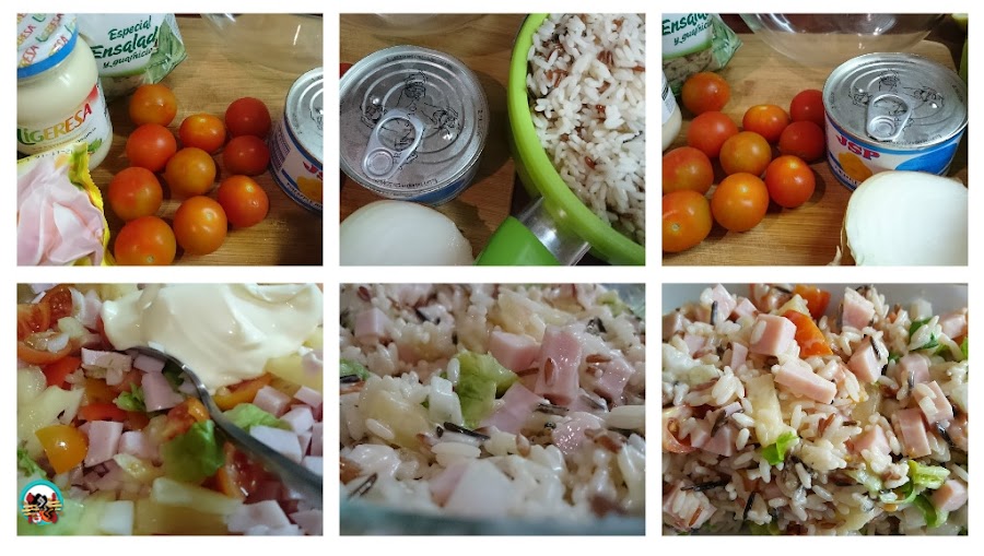 2.- Escurrimos las rodas de piña en almíbar. Las cortamos en trozos pequeños. Lavamos la lechuga, la escurrimos bien y cortamos en trozos pequeños. Lavamos los tomates, los secamos con papel de cocina y cortamos en dados, pelamos y picamos la cebolla en dados pequeños. Mezclamos todos los ingredientes con 2 cucharadas de mayonesa e incorporamos la ensalada al arroz. Guardamos en la nevera y servimos cuando este fría.