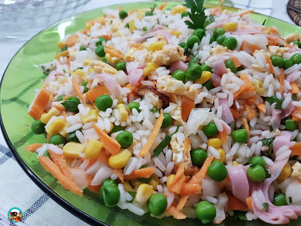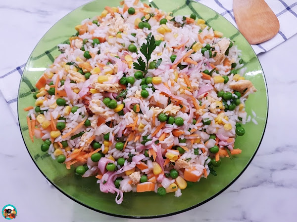¡Hoy,vamos a ir al grano!. Con esta fabulosa receta de ensalada de arroz con palitos de surimi y muchas cosas ricas.