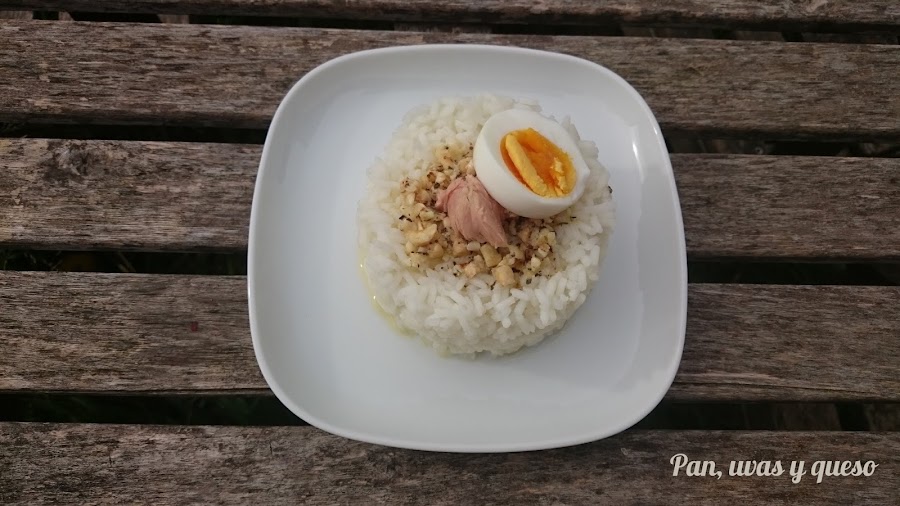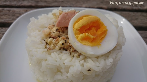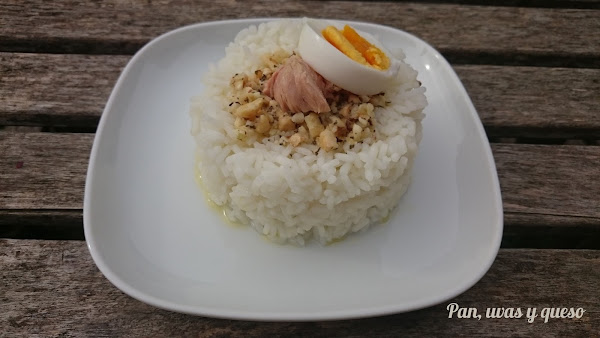 Colocamos en una fuente el arroz y añadimos los huevos cortados y el bonito.