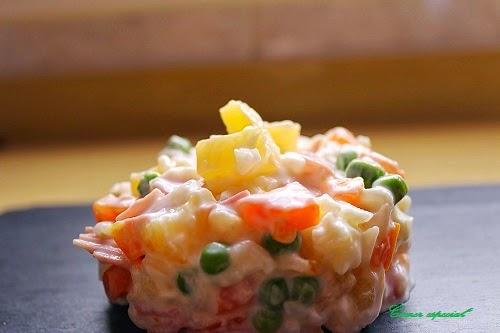 ELABORACIÓN: hacer el arroz blanco con 250 gramos de agua y una pizca de sal. Cuando el agua comience a hervir, introducir el arroz y mantenerlo el tiempo indicado en el paquete. Controlar por si hubiera que añadir más agua. Hervir en otro recipiente agua con un poco de sal, añadir la zanahoria troceada como en la foto. Si la queremos al dente, con 10 minutos será suficiente. Si nos gusta más hecha, unos 15 minutos. Cuando a la zanahoria le resten 2-3 minutos de cocción, poner los guisantes. Hacer a la plancha con un poco de sal la pechuga o hervir unos 8 minutos. Esperar a que todo se enfríe, para trocear la pechuga. También picaremos el pavo y mezclaremos todo en un mismo recipiente: guisantes, zanahorias, pechuga, pavo, piña escurrida y arroz. Ya lo tenemos todo para verter el yogur y mezclar nuevamente.