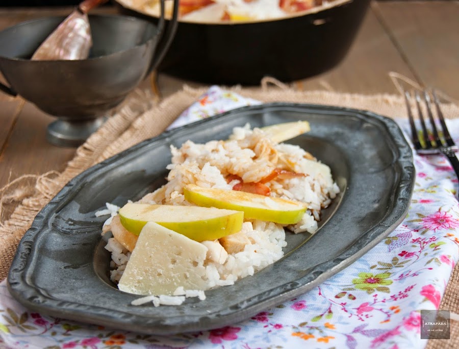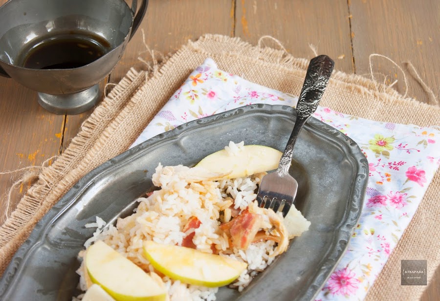 Lo primero que haremos será cocer el arroz en agua hirviendo ligeramente salada. Mientras asamos el pollo en una plancha con un poco de aceite. También freímos el bacon en su propia grasa en una sartén sin nada de aceite hasta que esté crujiente, sacamos y dejamos sobre papel absorbente para que pierda el exceso de grasa.