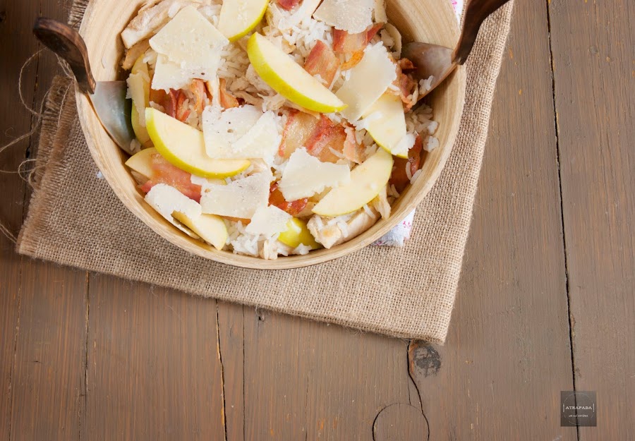 Preparamos la vinagreta, para ello mezclamos salsa de soja con un chorreón de vinagre de jerez y con aceite de oliva virgen extra, añadimos sal. Reservamos. Cuando el arroz esté cocido escurrimos el agua en un colador y dejamos que se enfrié un poco. Montamos la ensalada en una fuente de servir donde pondremos primero el arroz, después añadiremos el pollo en tiras y el bacon también cortado en tiras o cuadraditos, lavamos la manzana y cortamos, sin pelar, y también añadimos a la ensalada, terminamos con las las lascas de queso y regamos con la vinagreta todo y servimos.