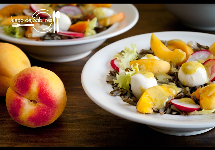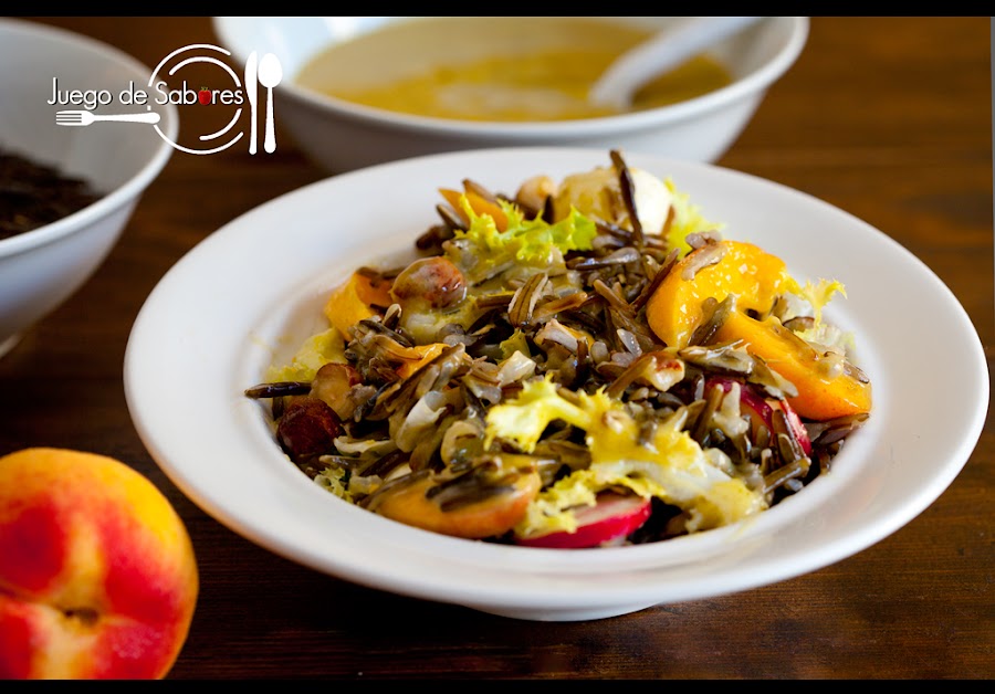 El otro día, en un restaurante de la costa, me sirvieron una ensalada de las de antes, con lechuga romana, tomate y cebolla. Estaba rica y me recordó y me hizo añorar tiempos pasados. Y es que una de las cosas, de los platos, que más ha evolucionado en las cartas de los restaurantes es el apartado de las ensaladas y, está claro, de rebote ha influido en las mesas familiares. Se pueden hacer una y mil ensaladas distintas. La de hoy lleva dos ingredientes originales: los albaricoques y el arroz salvaje que, cuando hicimos la "Ensalada de arroz tricolor" ya dijimos que, propiamente, no se trata de un arroz sino de la Zizania acuática, un cereal alargado y de color oscuro. Ya tenemos el contraste no sólo de sabores, sino también de colores que completamos con unas hojas amarillas de escarola, rabanitos rosados y unas perlas blancas de mozzarella. Estos ingredientes bien mezclados y aliñados con una vinagreta distinta pueden hacerte olvidar tiempos lejanos.