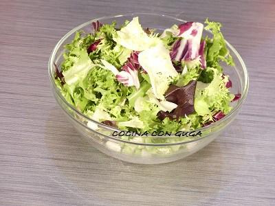 4. En una ensaladera agregamos los brotes tiernos de vegetales, añadimos escarola, rúcula y lechuga. Mezclamos bien las verduras.