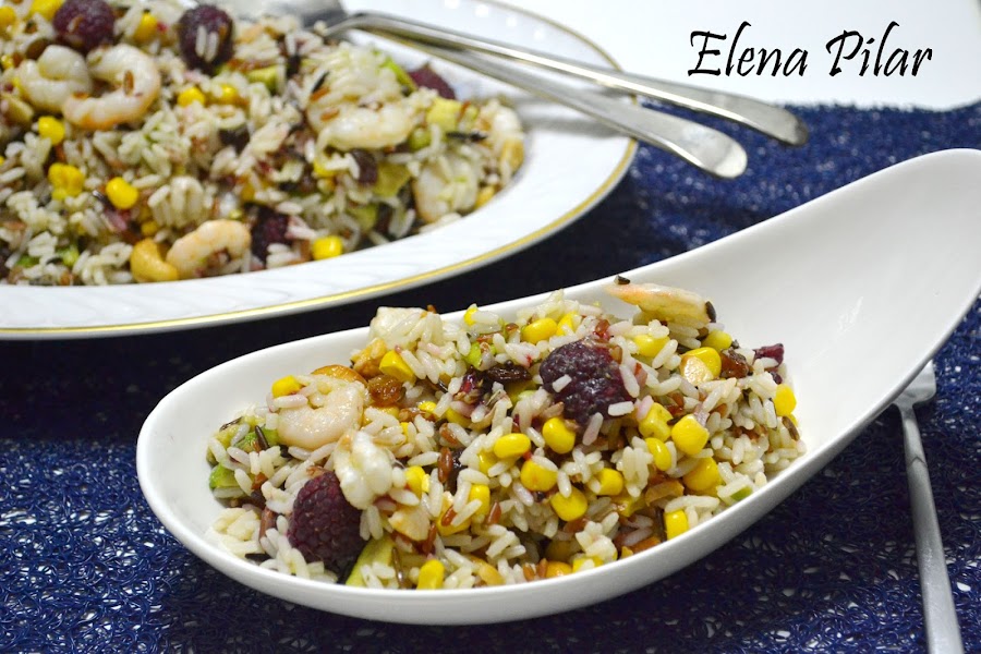 La receta la encontré en el mismo paquete de arroz que utilicé (SOS Ensaladas y guarniciones). Apenas varié nada. Tan solo las cantidades de ingredientes. Puse una cucharada más de pasas, anacados -ADORO este fruto seco, si no fuera por todo lo que engorda me los comería por kilos- y frambuesas.