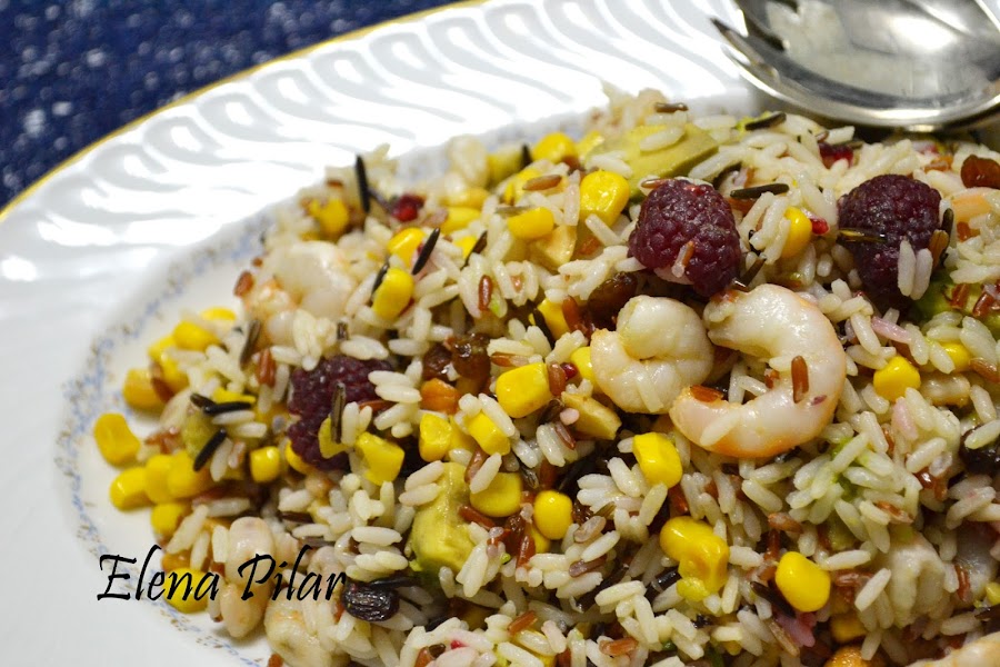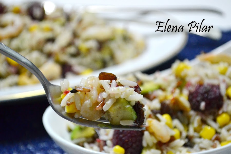 Ensalada de arroz tricolor (con pasas, anacardos, aguacate y ¡¡frambuesas!!: