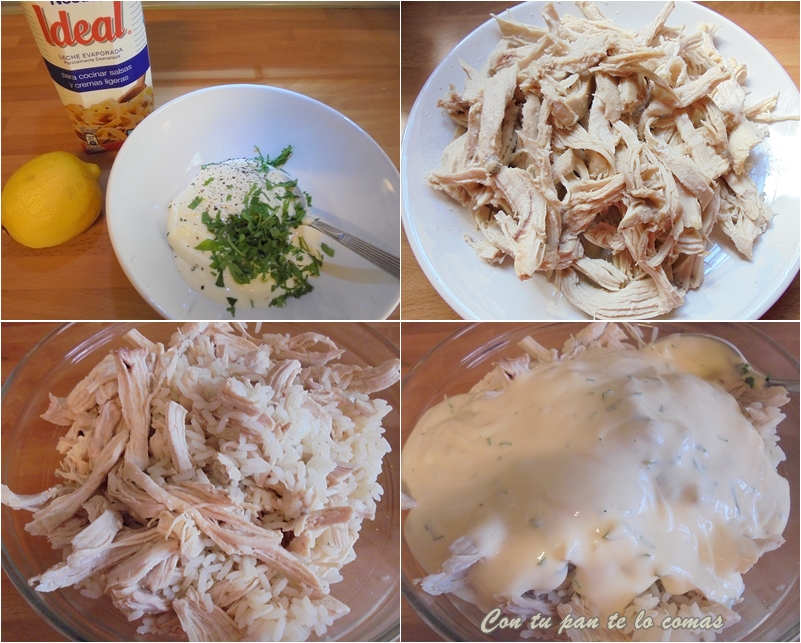 4. Mezclar el arroz con el pollo y la salsa de mayonesa