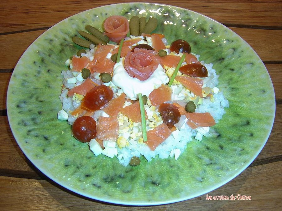Hay muchas maneras de preparar ahumados como primer plato, por ejemplo esta ensalada de arroz que resulta muy agradable a la vista y al paladar. Es una forma también de poder gastar restos de salmón o cualquier otro ahumado que nos hayan sobrado de otras preparaciones. No solo sirve para tostas o canapés, aquí os dejo un buen ejemplo.